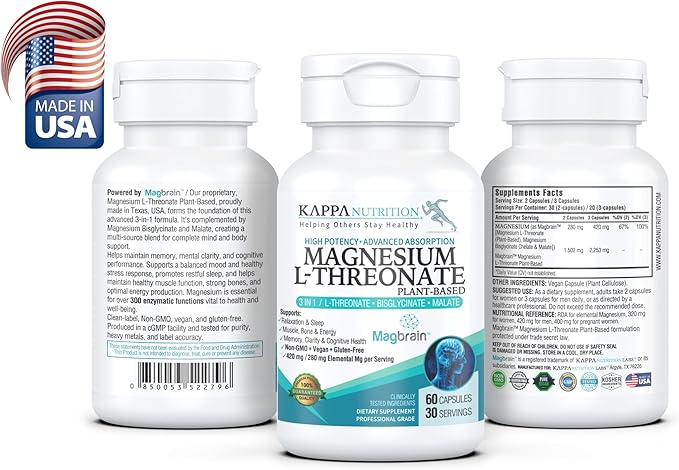- High-Potency Magnesium L-Threonate Plant-Based. Manufactured in Texas, USA. Each 3-capsule serving provides 420 mg elemental magnesium (280 mg per 2 capsules).