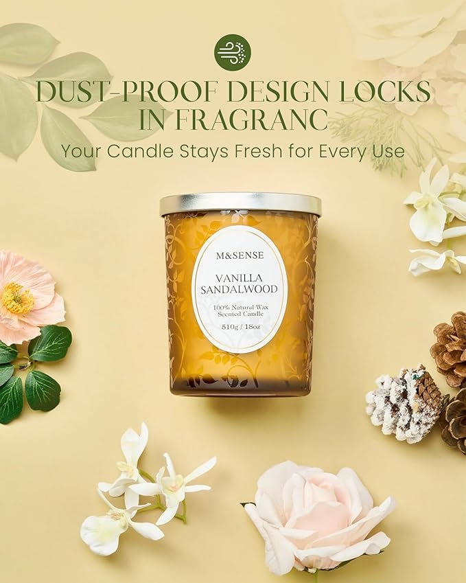 M&SENSE Vanilla Sandalwood Candle, Wooden Wick Strong Scented Candle,100 Hours Slow Burning No Toxin Natural Soy Wax 18oz, Stress Relief Aromatherapy Home Fragrance with Lid, House Warming Gift