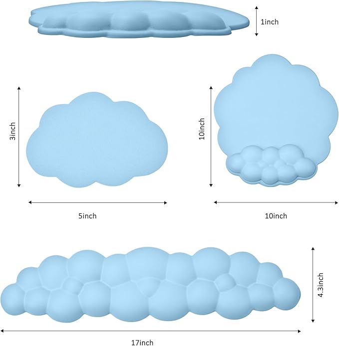 - Cloud-shaped Design: This keyboard wrist rest and mouse pad set features a unique cloud-shaped design, offering an ergonomic fit that perfectly supports your hands. The textured surface enhances airflow, keeping your wrists cool and comfortable while preventing sweat or discomfort during extended use. Stylish and functional, these aesthetic desk accessories make the perfect companion for both work and study sessions, adding a touch of charm to your workspace