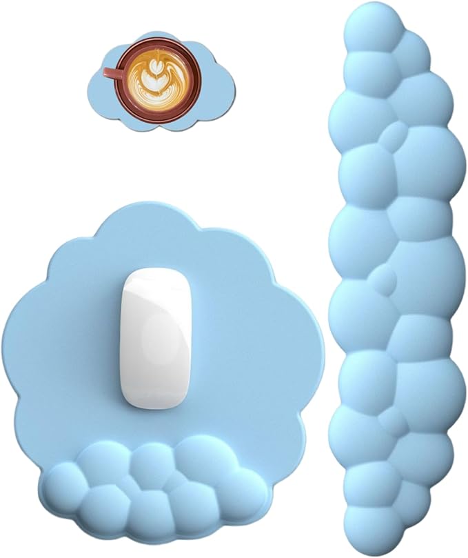 - High-Quality Materials: Made with natural rubber foam, the cloud-shaped keyboard and mouse wrist rest set offers a soft, smooth, and breathable surface for ultimate comfort. Lightweight, durable, and waterproof, the adorable mouse pad with wrist rest is designed to withstand daily use while being easy to clean. Provide excellent cushioning and quickly bounce back to their original shape without deforming, ensuring long-lasting support and comfort for your hands and wrists