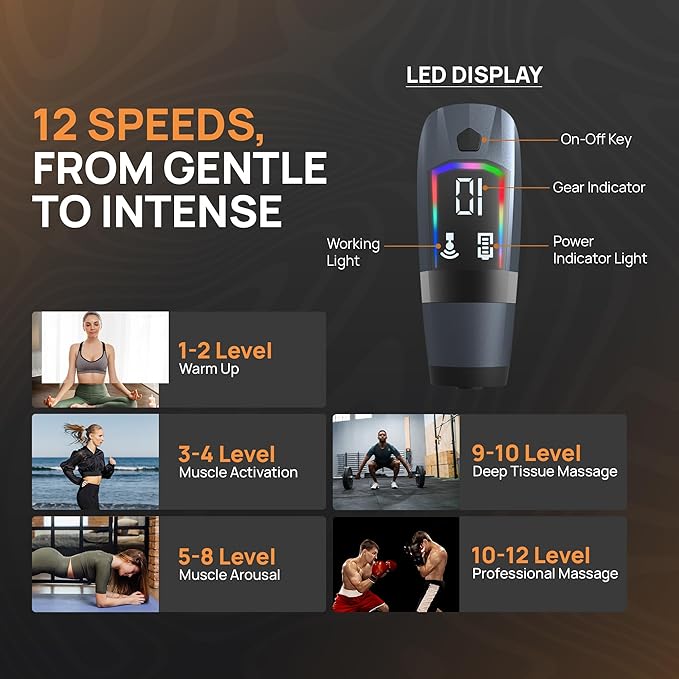 - šš šš©ššš šššÆšš„š¬ š°š¢šš” ššš šš«ššš¢š¬š¢šØš§ ššØš§šš«šØš„: This Electric Muscle Relaxation with 12 adjustable speed settings ranging from (2200 RPM) to deep tissue therapy (3500 RPM). The LCD screen displays battery life, speed, and timer for effortless adjustments.