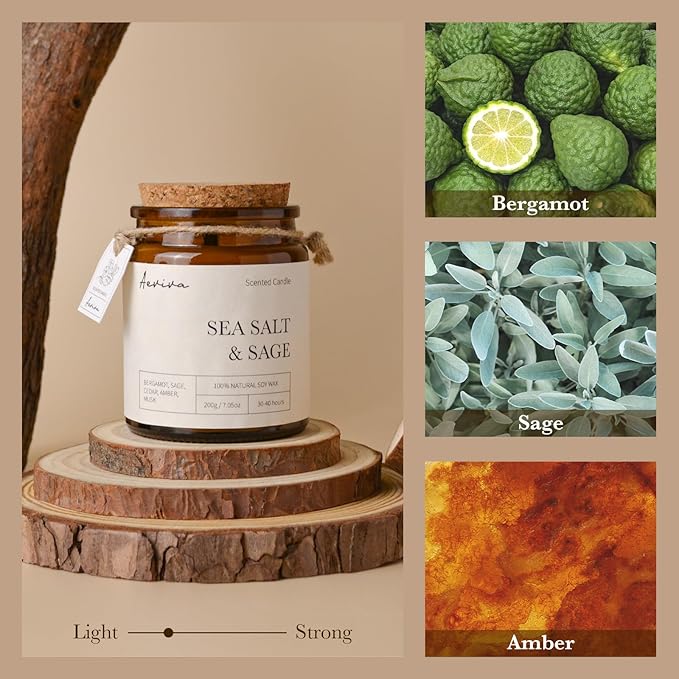 - Sea Salt & Sage Scented Candle: A light and refreshing aroma that captures the essence of coastal air. Crisp sea salt notes mingle with soothing sage, creating a clean, airy aroma that feels both calming and uplifting.