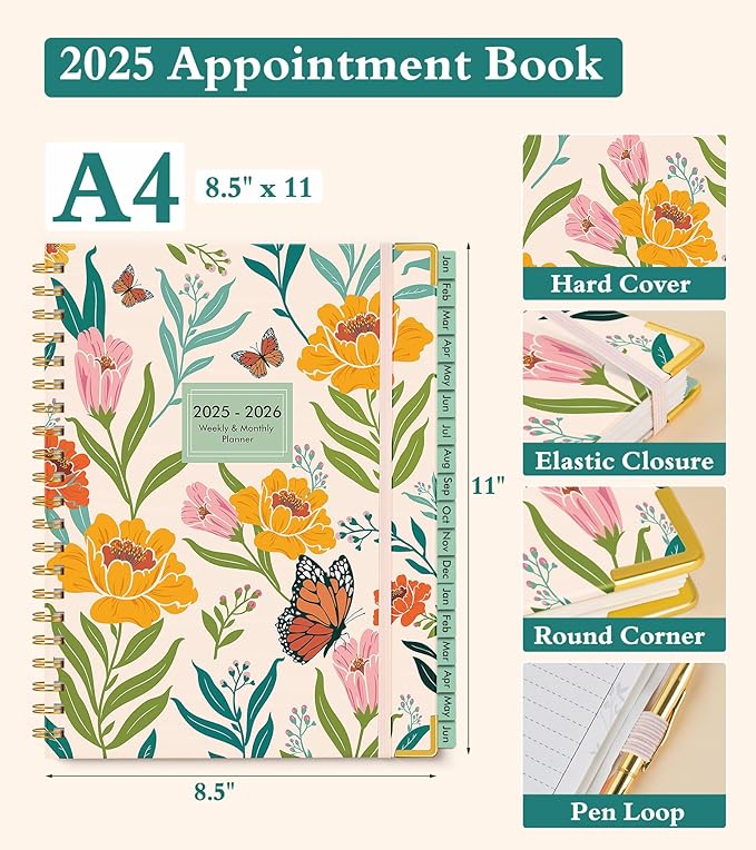 - 【Upgraded Quality】 Unlike other flimsy planners, our daily 2025-2026 appointment planner features a fountain pen friendly paper for easy writing, no ink bleed through. The metal spiral spine that enables the planner to lay flat when open. A sturdy hard cover, ensuring hold up for the entire year. Monthly tabs for simplifying navigation are laminated to resist tears. Pen holder, elastic closure, inner pocket, removable bookmark ruler boosting your planning convenience. 2025-2026 agenda book is perfect for busy planners.
