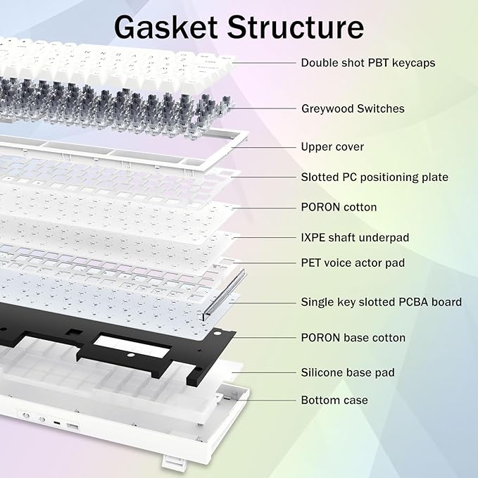 - Gasket Structure and PCB Single Key Slotting: This computer keyboard features a gasket structure, extended integrated silicone pad, and PCB single key slotting, better optimizes resilience and stability, making the hand feel softer and more elastic. Five layers of filling silencer fills the gap between the PCB, the positioning plate and the shaft,effectively counteracting the cavity noise sound of the shaft hitting the positioning plate, and providing a solid feel