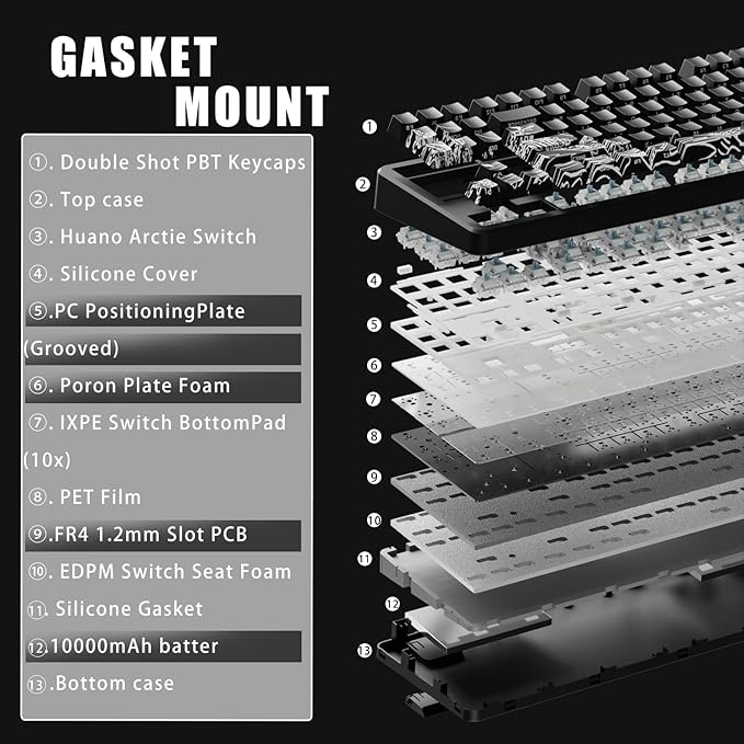 - FIVE-LAYER GASKET STRUCTURE: The 80% layout and 87-key mechanical gaming keyboard feature a five-layer gasket structure, built with double layers of sound-absorbing foam, an IXPE switch bottom pad (10x), an FR4 1.2 mm slotted PCB, PET film, and a silicone bottom pad. This sophisticated construction significantly reduces typing noise and resonance, providing a premium typing experience in a tranquil focused environment.