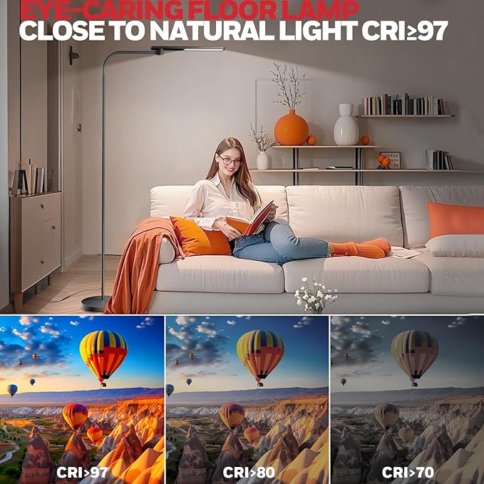 - [Eye-Friendly Lighting for Reading]: modern floor lamp Built with 96 Sunturalux "2835 full-spectrum LED beads, this floor lamp for office delivers soft, natural-like lighting with CRI≥97, ensuring accurate color rendering without glare or flicker. The RG0 blue light and anti-strobe design make it a health-focused, eye-caring choice for stress-free reading, crafting, or working for long hours