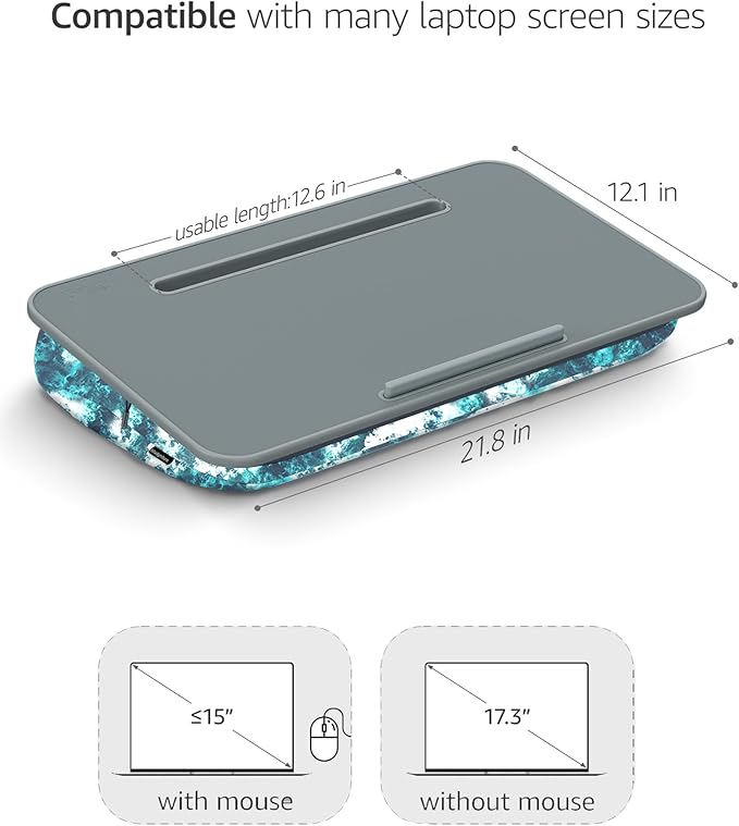 - 2. [Large Workspace]: The desktop of the laptop desk measures 21.8 inches wide and 12.1 inches deep. It can fit laptops up to 17 inches. There is enough surface space for a mouse only when used with laptops that are 15.6" in size or smaller.