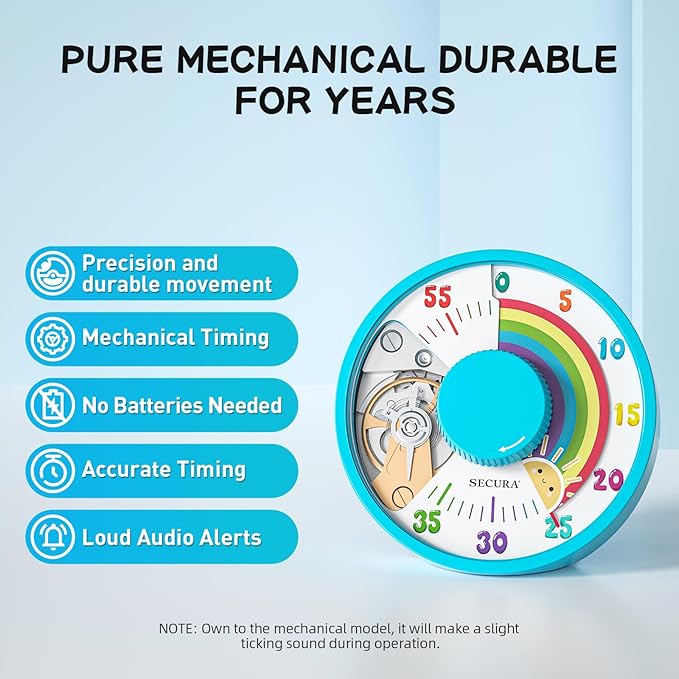 - NO BATTERIES REQUIRED - Completely mechanical countdown timer for school classroom, office working, kitchen cooking, gym body building, and more! High accurate mechanical timing. No batteries needed