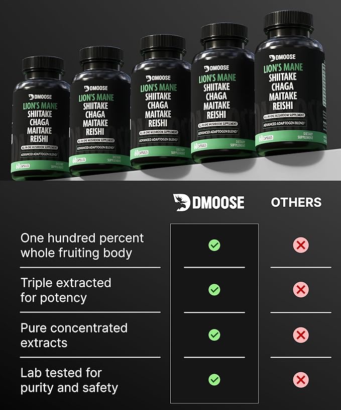 - 5 MUSHROOMS IN 1 POWERFUL CAPSULE: Simplify your health routine with DMoose Mushroom Supplements, a potent 5-in-1 formula combining Lions Mane, Chaga, Maitake, Shiitake, & Reishi Mushrooms. Each capsule provides boosting benefits to support your brain health, memory, focus, energy, and immune support.