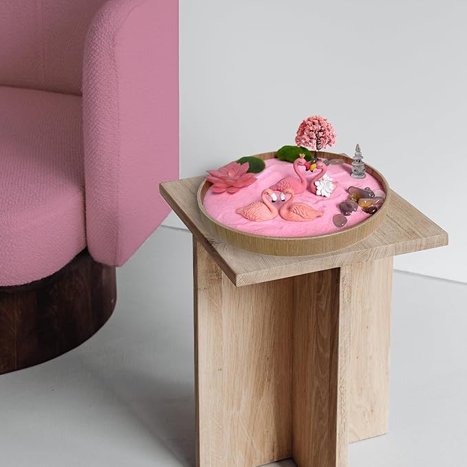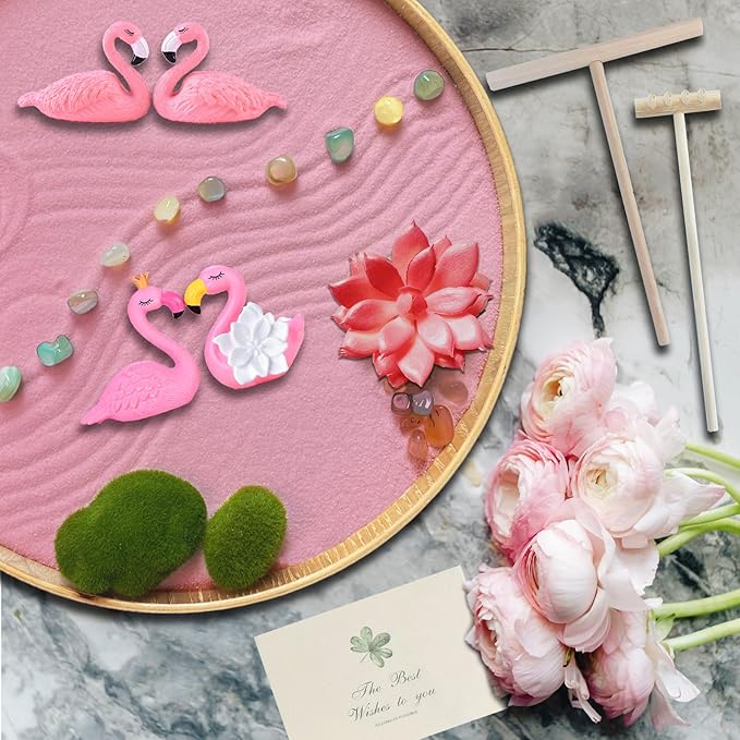 - Complete Flamingo Zen Garden Kit – Transform any space with this all-inclusive pink Zen sand tray garden kit, featuring 4 flamingo figurines, a 9.4-inch bamboo wood round tray, pink lotus, cherry blossom tree, stone pagoda, moss, and premium sand. Perfect for creating a calming retreat at home, office, or any tabletop.