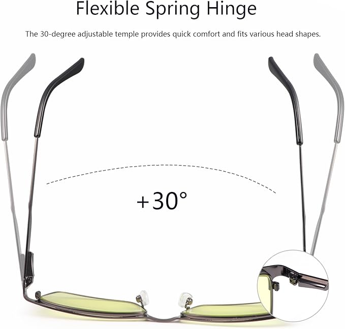 - Spring Hinges & Lightweight:Light frames are comfortable to wear and won't put any pressure on the temples and bridge of your nose, and their spring hinges won't bend over time,The temple is elastic and can be stretched outward, suitable for different face shapes.Classic Rectangular frame design keeps you looks professional and fashionable while working or gaming. And also help protect from the glare of their laptop screen, smartphone or gaming PC.