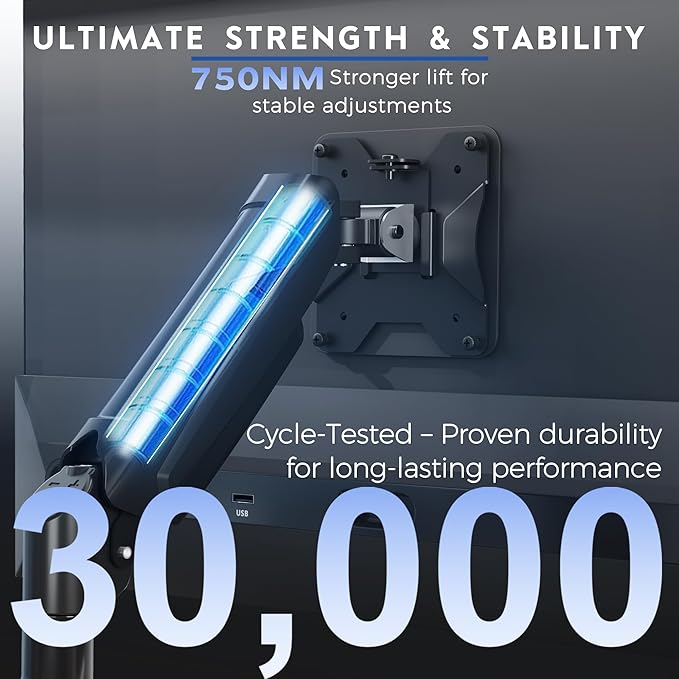 - BUILT-IN GAS SPRING SUPPORT – Equipped with a 750 N⋅m gas spring, this monitor stand is durability-tested for 30,000 cycles, ensuring smooth, stable, and long-lasting support for your monitors, providing effortless adjustments