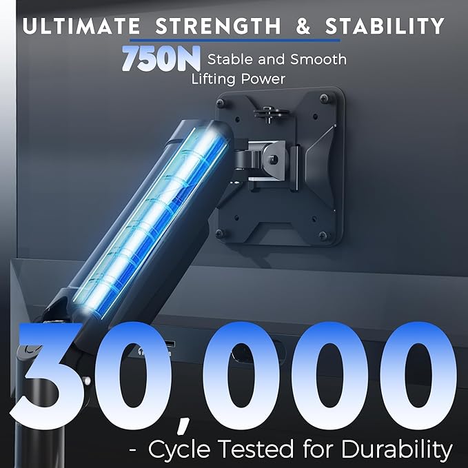 - BUILT-IN GAS SPRING SUPPORT – Equipped with a 750 N⋅m gas spring, this monitor stand is durability-tested for 30,000 cycles, ensuring smooth, stable, and long-lasting support for your monitors, providing effortless adjustments