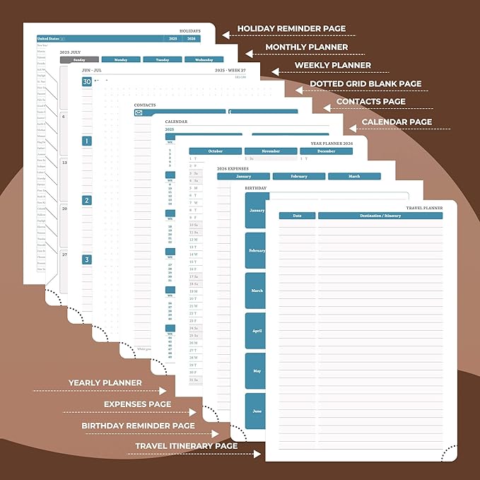 - Monthly Planner: Covers July.2025-Dec.2026. It adopts a double-page design for one week, so you can get a general overview without turning pages. The weekly planner page provides writing space for arrangement of daily tasks, priority management and activity records; the left side of the monthly plan marks important dates, and the right side plans special tasks