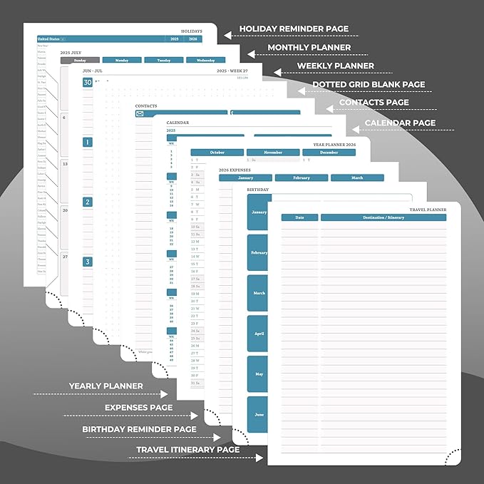 - Monthly Planner: Covers July.2025-Dec.2026. It adopts a double-page design for one week, so you can get a general overview without turning pages. The weekly planner page provides writing space for arrangement of daily tasks, priority management and activity records; the left side of the monthly plan marks important dates, and the right side plans special tasks