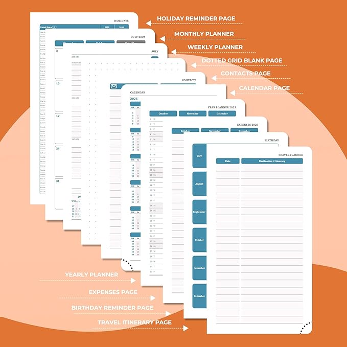 - Life Personalized System: Weekly plan, Monthly & year planner pages, holiday reminders throughout the year, birthday record area for relatives and friends; set up record inspiration and plans with the dot matrix note area; at the same time, weekly planner provides travel planning and bill expense management
