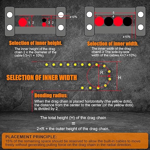 - The drag chain's internal height is determined by the cable diameter (which should be less than 90% of the internal height), while the internal width is based on the number of cables (ensuring total width is less than 90% of the internal width). The bending radius of the drag chain is determined by the installation space.
