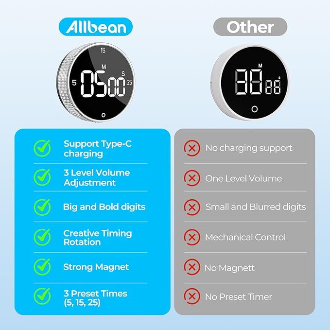 - 【3 Convenient Preset Timers for Maximum Efficiency】: The Allbean kitchen digital timer features 3 preset options (5 mins, 15 mins, and 25 mins), perfect for quick, hands-free timing. With a large, easy-to-read LED display and bold digits, it’s designed to seamlessly integrate with the Pomodoro Technique—work for 25 minutes, then take a 5-minute break, helping you stay focused and boost productivity. Ideal for both work and kitchen tasks