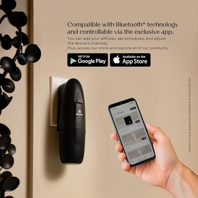 - EASY TO SET UP WITH CUSTOMIZABLE SETTINGS - All done through the exclusive AromaPlan app in the palm of your hand, in a few minutes. This new scent diffuser is controlled exclusively compatible with Bluetooth Technology (Bluetooth is a registered trademark of Bluetooth SIG.) through the AromaPlan app (available for IOS and ANDROID).