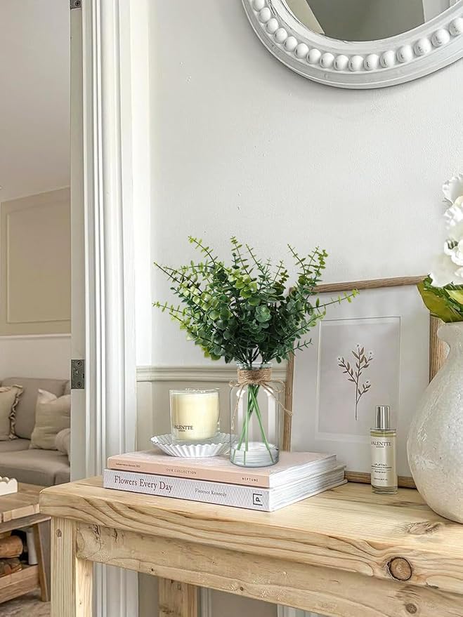 - Ideal Size: Artificial eucalyptus plant stems stand at 13.5 inches tall, paired with a glass vase measuring approximately 5.1×2.55×2.55 inches, making it suitable for any small corner of your home. Whether by the fireplace, on a bookshelf, or by the windowsill, it seamlessly integrates, adding a touch of natural greenery to various spaces.