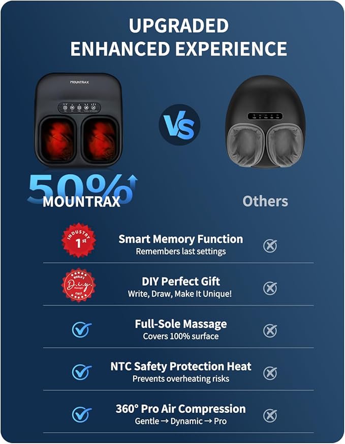 - Your Personal Foot Masseur - Mountrax new foot massager optional two level massage intensity and three level full-coverage compression for your foot. It is equipped with three massage nodes that providing deep kneading foot massage for the front, middle and back of the foot, which can relieve foot pain and fatigue after a busy day.