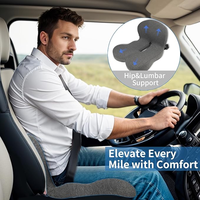 - One Cushion, Double Comfort: Our uniquely molded one-piece design combines lumbar support and seat cushion comfort, offering comprehensive support that alleviates discomfort from prolonged sitting. Say goodbye to hip and lower back pain, including sciatica, and enjoy all-day comfort