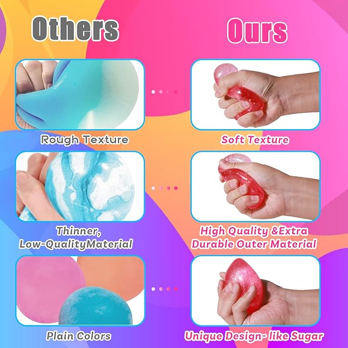 - 【Sugar STRESS BALLS FOR ADULTS】These stress ballses all with brilliant glitter sequins inside which make them more beautiful than other stress balls. Each ball measures abouot 1.57", suitable size for kid's little hands. And no matter how you squeeze, they will return to their original shape. Your children are more engaged when throwing and rolling them together with their friends.