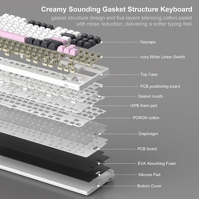 - 5-LAYER SOUND ABSORBING FILLING: In order to improve the noise situation, this gasket keyboard is equipped with a IXPE foam pad, PORON foam, diaphragm, EVA soundproofing foam and silicone absorbing pad in the gaps between the positioning plate, PCB board and bottom. This reduces the resonance space inside the keyboard, thereby suppressing hollow sounds and making every key press comfortable and pleasant. For gamers and office users, this keyboard is a great addition to the desktop.
