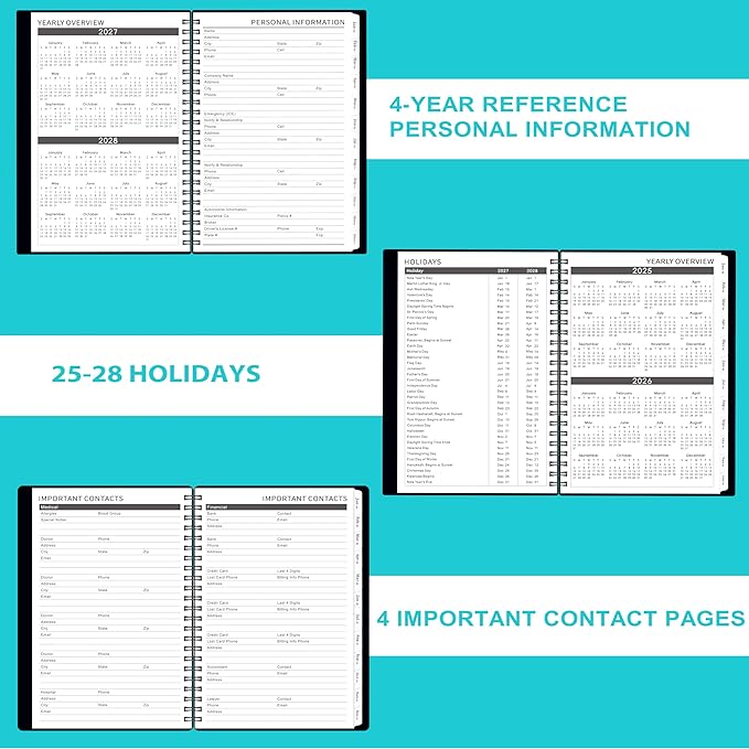 - 🎈 PROFESSIONAL DESIGN - Sturdy metal twin-wire binding allows for 360 degree folding over. Flexible cover to protect inner pages of this 2025-2028 monthly planner. Coated monthly tabs and back double-sided pocket for storing your scattered items, such as cards.