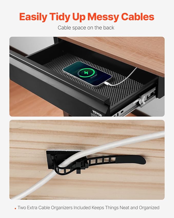 - ✅[Cable Management]: The pull-out drawer attachment features cable holes at the back, ideal for storing devices that need power. Keep your desk neat by placing devices inside and running cables through the hole. Plus, two cable organizers help secure cords under the desk, keeping your workspace tidy and organized.