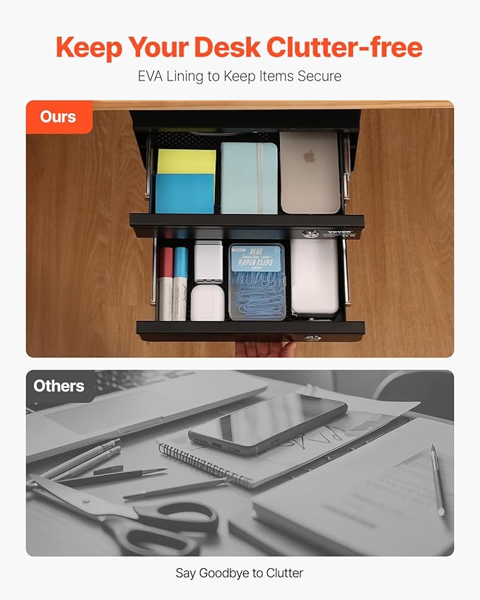 - ✅[Efficient Organization&Simple assembly]: Say goodbye to cluttered desktops! Store your most-used items or tools in this under table drawer to keep your desk tidy. With a EVA drawer liner, your items are cushioned, reducing the risk of scratches. Simple assembly means you can follow our instruction manual and do it on your own. (For easier installation, it's recommended to flip the desk surface to secure the drawer, saving you effort.)