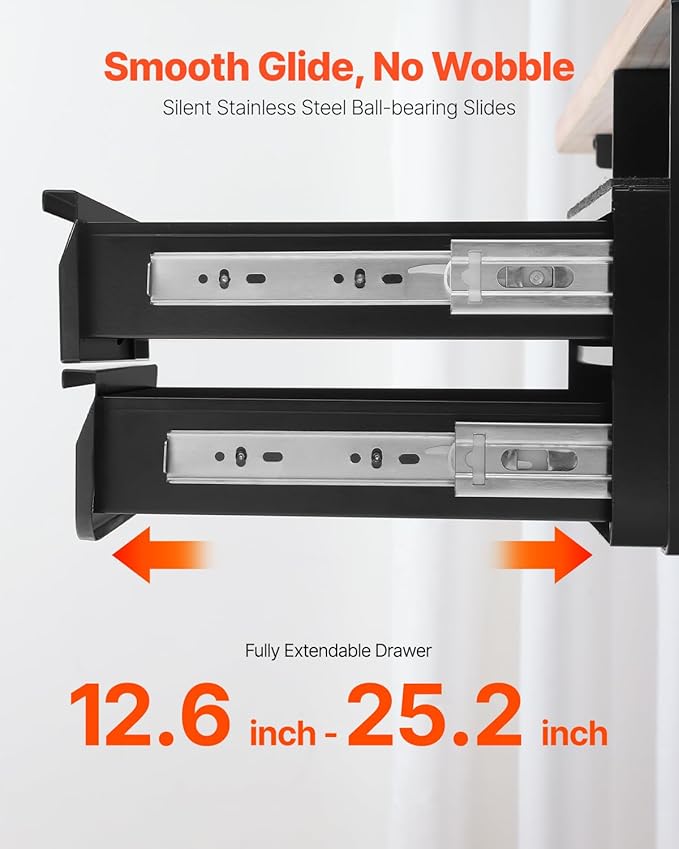 - ✅[Smooth & Silent Sliding]: Pull the hidden handle and enjoy the smooth glide of this pull-out drawer attachment. Equipped with two high-quality stainless steel ball-bearing tracks, it opens quietly and effortlessly, without any jerking or annoying noise. Fully extendable, this slide out standing desk storage attachment makes accessing your items a breeze.