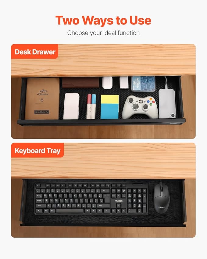 - ✅Drawer/Keyboard Tray Combo: This 26-inch under table drawer for desk not only provides hidden storage under your desk but also doubles as a keyboard tray by easily removing the front panel, keeping you comfortable while working or gaming. The EVA drawer liner helps reduce item collisions and damage.