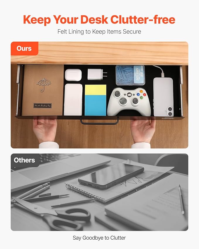 - ✅[Ample Leg Room]: This undermount desk drawer fits most desk thicknesses and provides ample space beneath for your legs. With a 3-inch height, it allows you to stretch comfortably, ensuring a more relaxed workspace during long hours. It won’t interfere with your workspace, providing flexibility to stretch and relax.