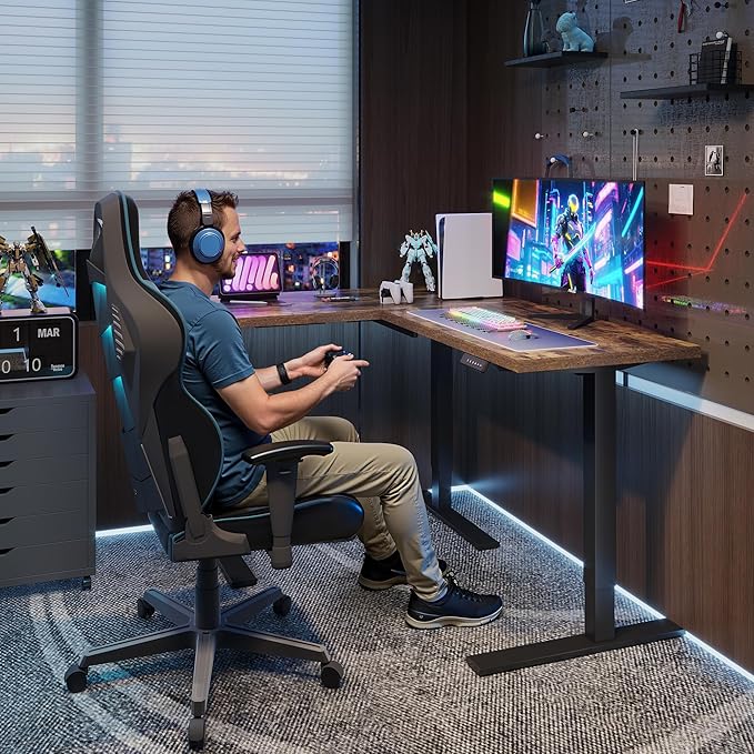 - 1. Sturdy L-Shaped Design with Three-Leg Stability Crafted with a heavy-duty steel frame and durable laminate desktop, this L-shaped desk offers superior stability in any corner setup. The innovative three-leg design maximizes floor space while providing robust support, ensuring wobble-free performance even at full height. Ideal for dual-monitor setups or multitasking.