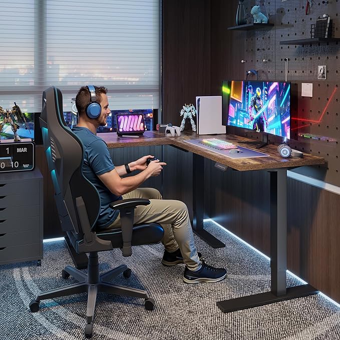 - 1. Sturdy L-Shaped Design with Three-Leg Stability Crafted with a heavy-duty steel frame and durable laminate desktop, this L-shaped desk offers superior stability in any corner setup. The innovative three-leg design maximizes floor space while providing robust support, ensuring wobble-free performance even at full height. Ideal for dual-monitor setups or multitasking.
