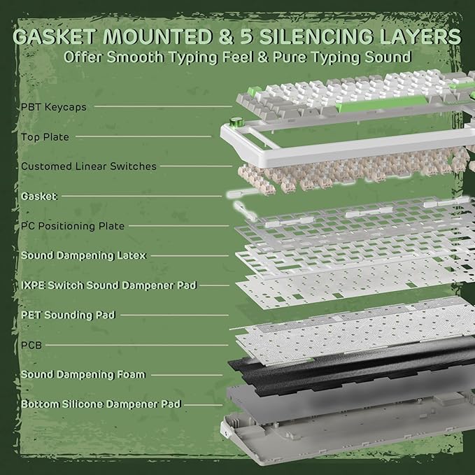 - Five Sound-Dampening Layer — With five layers of internal padding, including 2 layers of thick sound-absorbing foams, an IXPE switch pad, silicone dampener and PET sound-enhancement film, this keyboard structure significantly minimizes hollow sounds and cavity noise, delivering a super smooth and satisfying typing experience.