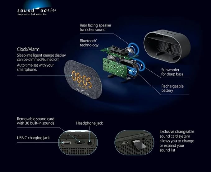 Sound Oasis® Bluetooth® Sleep Sound Therapy System® Alarm Clock - Sleep Better, Manage and Mask Tinnitus, 30 Built-in Sounds, Sleep-Friendly Lighting, Travel Friendly (BST-150)