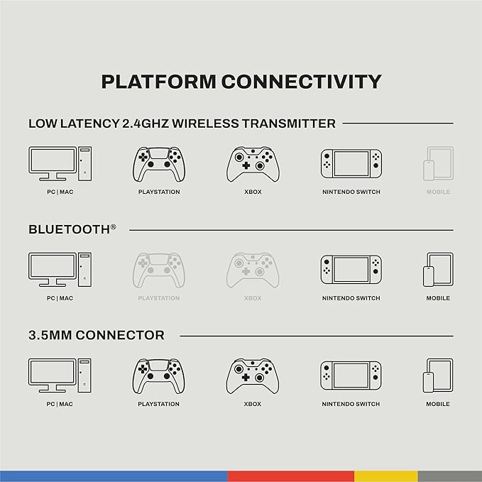 - MULTI-PLATFORM COMPATIBILITY. Connects to Xbox, PlayStation, Nintendo Switch, PC and mobile devices. Included USB-A low latency transmitter allows for wireless connectivity to Xbox, PlayStation, Nintendo Switch and PC, giving you 25ms fast wireless audio transmission so you can hear every sound with no delay.