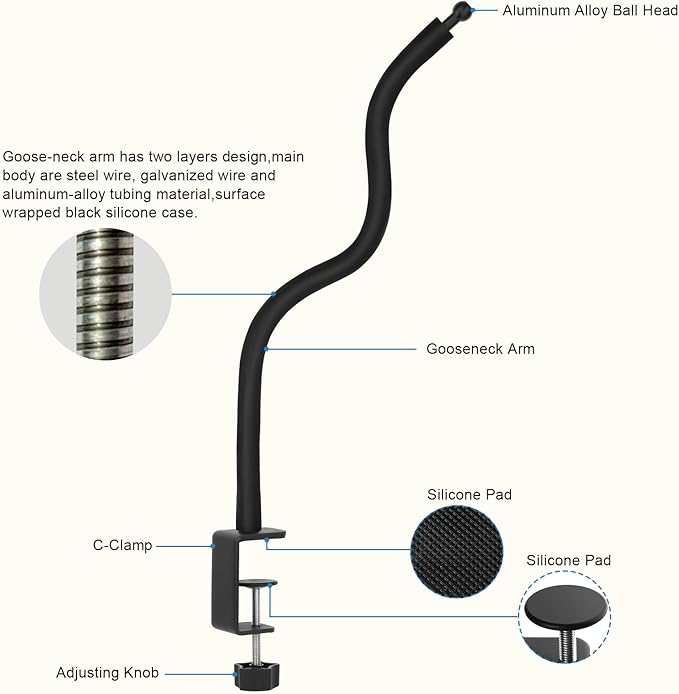 - 【Gooseneck Arm 】:Unique design feature and exquisite craftsmanship,goose-neck arm has two layers design,main body is steel wire and galvanized wire,surface is made of silicone material,length is 19.69 inch / 50 cm,diameter is 0.59 inch / 1.5 cm,aluminum alloy 0.669 inch / 17mm size ball head on top of arm.