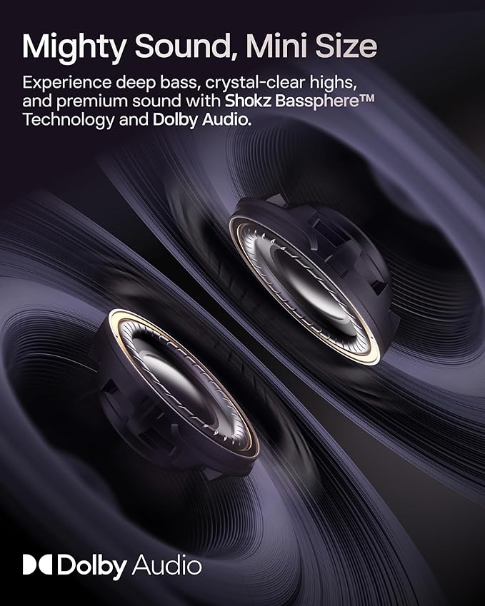 - Rich, Open-Ear Audio - Shokz signature open-ear design keeps you connected to the world while you experience the pocket-sized power of OpenDots ONE's premium Dolby Audio and Bassphere Technology.