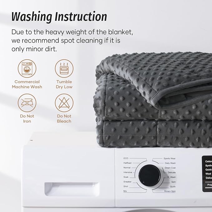 - Washing Instruction: Our weighted blankets are designed for durability and wrinkle resistance, no pilling, fading, or shrinking. We recommend washing in a commercial machine and tumble drying on a low temperature, blankets should not be bleached or ironed, if only lightly soiled we recommend spot cleaning