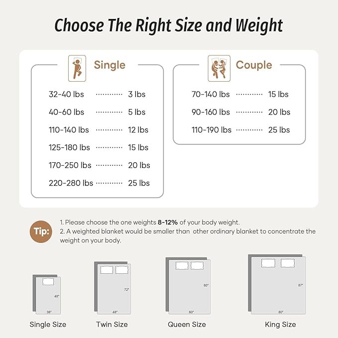 - Choosing the Right Weight: We suggest that you start with a blanket which weighs approximately 8%-12% of your body weight. Usually, it takes 3-5 days to adjust to the weight of this blanket. A quick note: a weighted blanket would appear smaller than a traditional one since its weight needs to concentrate on your body, so the blanket doesn't hang over the edge of the bed