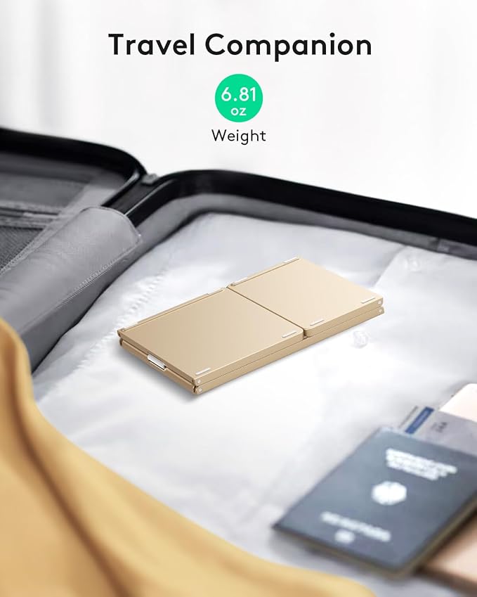 - 【Exquisite & Lightweight Portable Keyboard】Golden matte exterior, made of ABS+PC material, lightweight but stable, without fear of daily wear and scratches. The elegant matte design, excellent touch and clean look make it a perfect match for your tablet, phone and laptop. Only 5.53-ounce, palm-sized keyboard can be folded up and carried around. Provide you with maximum convenience with minimal weight and size. It must be the good choice for editors!