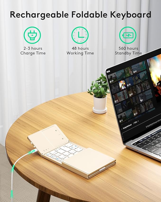 - 【Sensitive Touchpad Foldable Keyboard】Upgrade sensitive touchpad supports mouse left and right key function, so you can control the device without using mouse. Updated richer and more practical multimedia shortcut functions make your work more convenient and more efficient! Built-in rechargeable battery can last for 48 hours or 560 hours after 2-3 hours of charging. One full charge last enough for your short business trip or vacation!