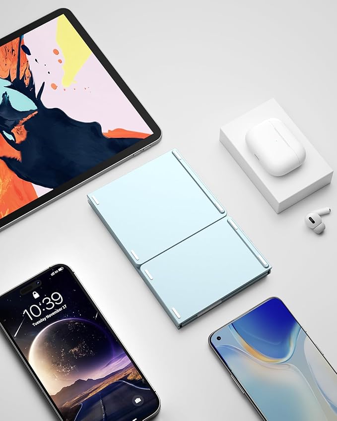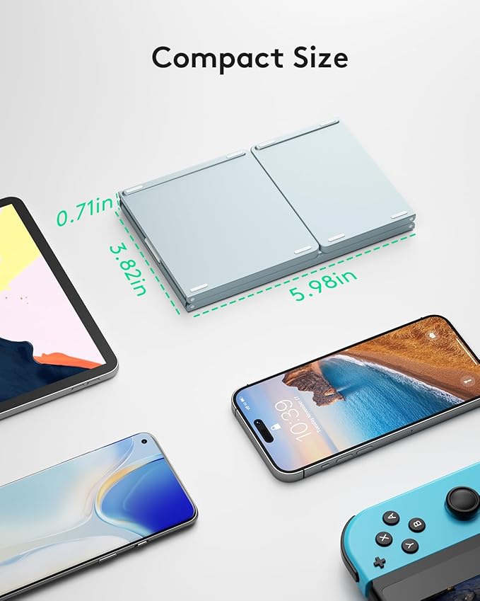 - 【Exquisite & Lightweight Portable Keyboard】Young Blue matte exterior, made of ABS+PC material, lightweight but sturdy, without fear of daily wear and scratches. The elegant matte design, excellent touch and clean look make it a perfect match for your tablet, phone and laptop. Only 5.53-ounce, palm-sized keyboard can be folded up and carried around. Provide you with maximum convenience with minimal weight and size. It must be a good choice for editors!
