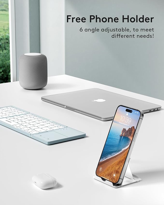 - 【Folding Bluetooth Keyboard & Phone Stand Holder】Extremely thin design of the portable folding keyboard allows you to fold it up and put it in your pocket or bag without taking up too much space. The phone stand holder, best companion for folding keyboard, gives you perfect screen angle. Near-standard size design provides accurate, fast typing, just like the desktop keyboard you are used to. Quiet keys allow you to focus on your work. Perfect gift for travel and business trips!