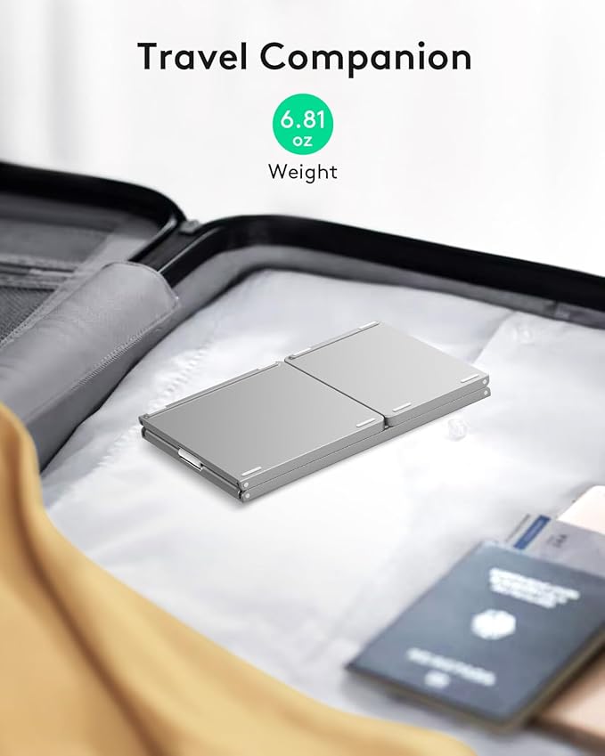 - 【Exquisite & Lightweight Portable Keyboard】Sliver matte exterior, made of ABS+PC material, lightweight but stable, without fear of daily wear and scratches. The elegant matte design, excellent touch and clean look make it a perfect match for your tablet, phone and laptop. Only 5.53-ounce, palm-sized keyboard can be folded up and carried around. Provide you with maximum convenience with minimal weight and size. It must be the good choice for editors!