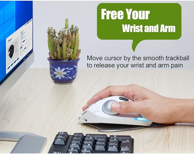 - 【Thumb Operation】Thumb-operated, you can precisely and smoothly move the cursor by rotating the trackball with your thumb without moving your wrist and arm. If you frequently use a mouse in your daily life, it will reduce muscle strain on your wrist and arm. The wireless trackball mouse can freely switch between 0-degree and 18-degree angle using a detachable aluminum alloy base, keeping your palm in a natural position for long-term use without fatigue.