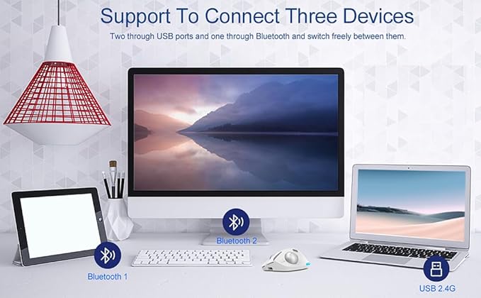- 【Two Wireless Connection Modes】This wireless mouse offers two connection modes: USB 2.4G wireless mode and Bluetooth mode. It can connect by plugging the receiver into the USB port of your device or via Bluetooth (the device needs to have Bluetooth functionality). It can connect to three devices simultaneously and switch freely between them. For example, you can easily and quickly switch mouse control from a PC to a laptop, tablet, etc.
